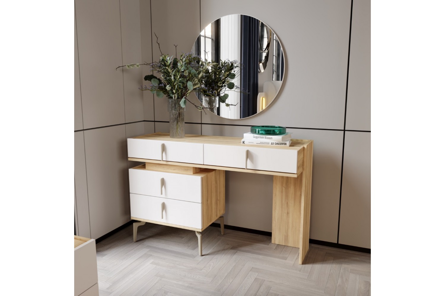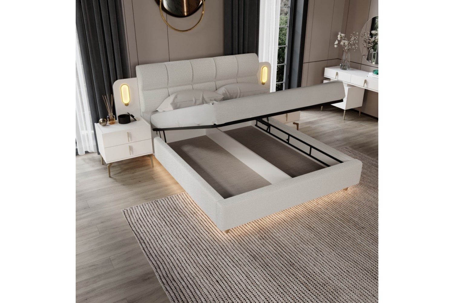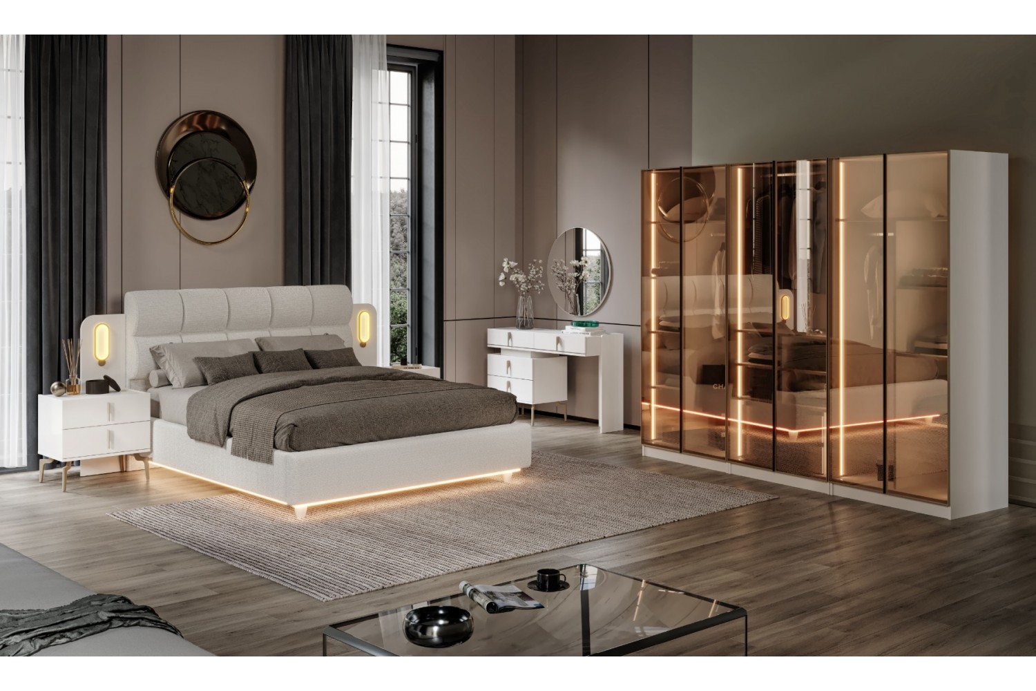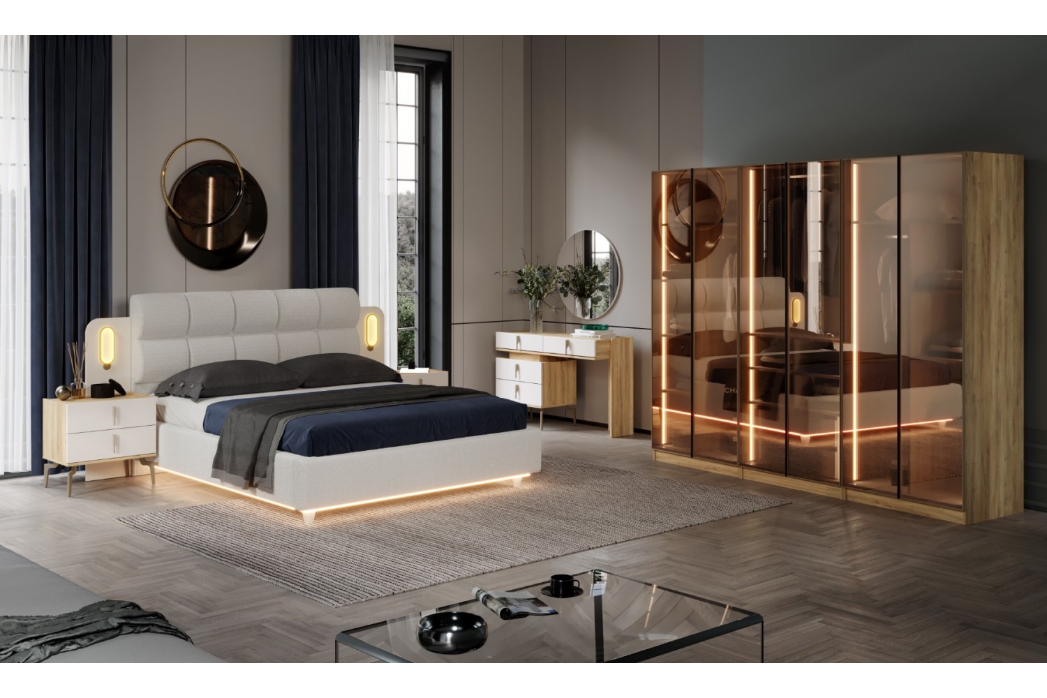 Takım İçeriği 1 Adet başlık ve çelik profil baza , 1 adet gardırop, 2 adet komidin ve 1 adet şifonyerden oluşmaktadır.