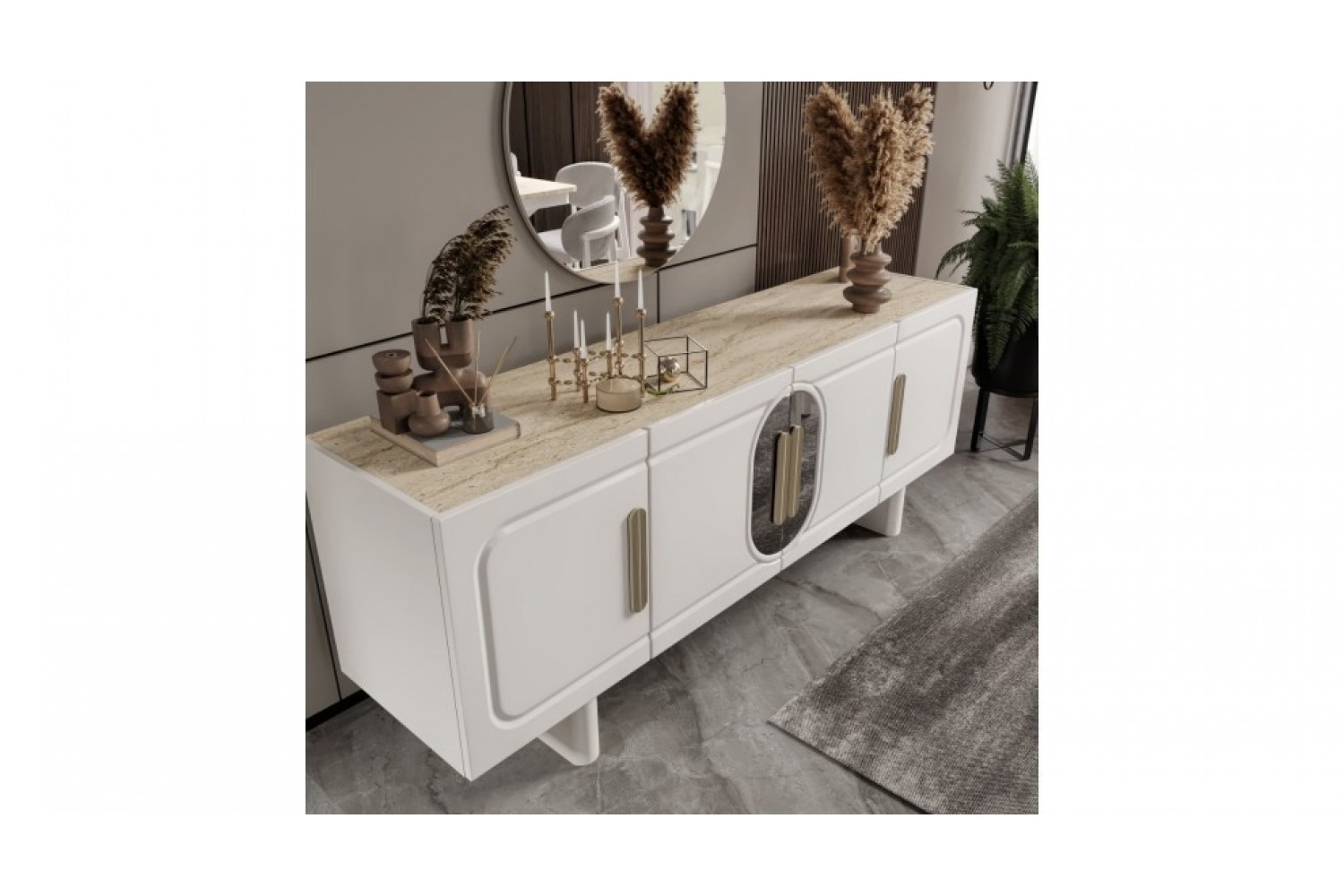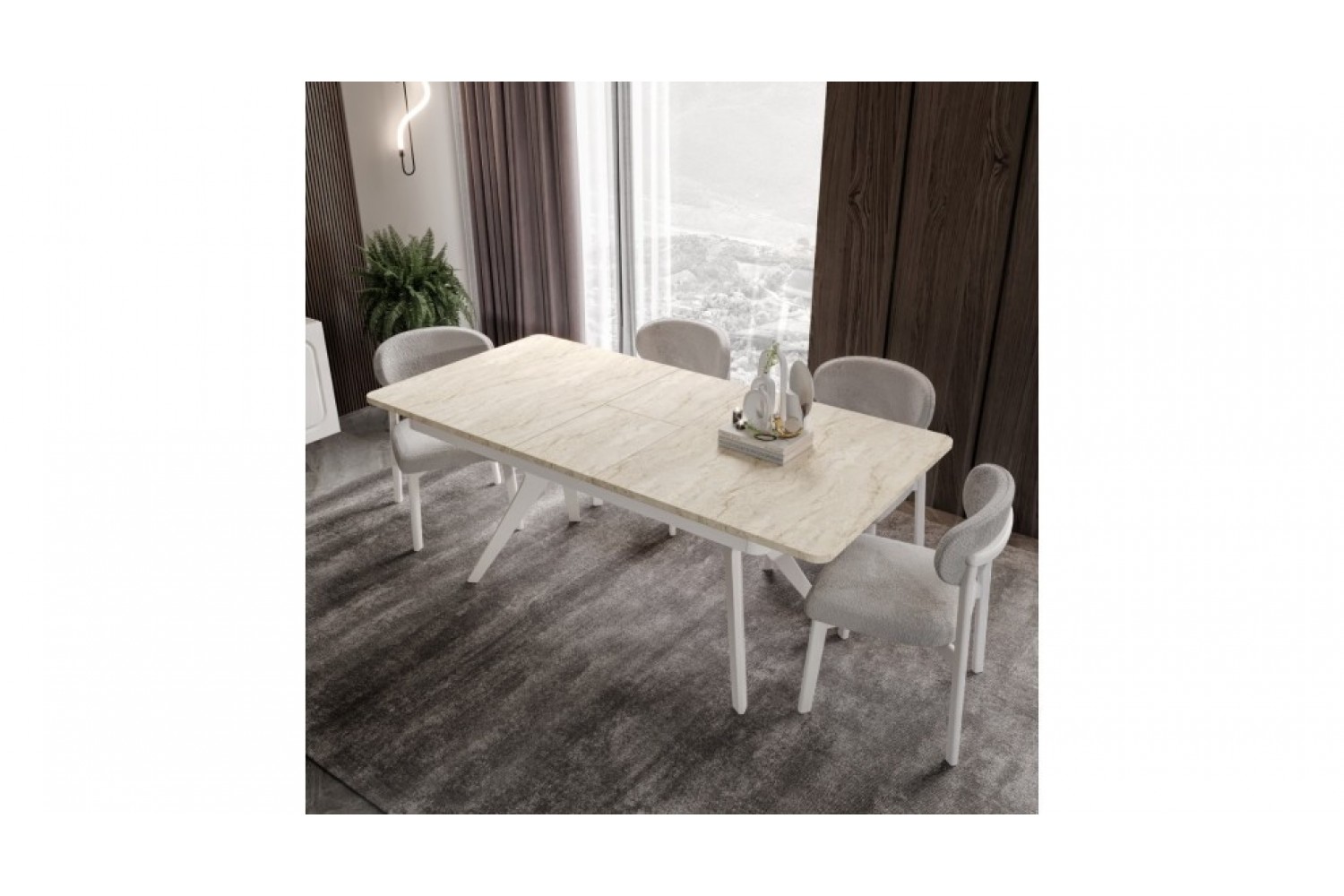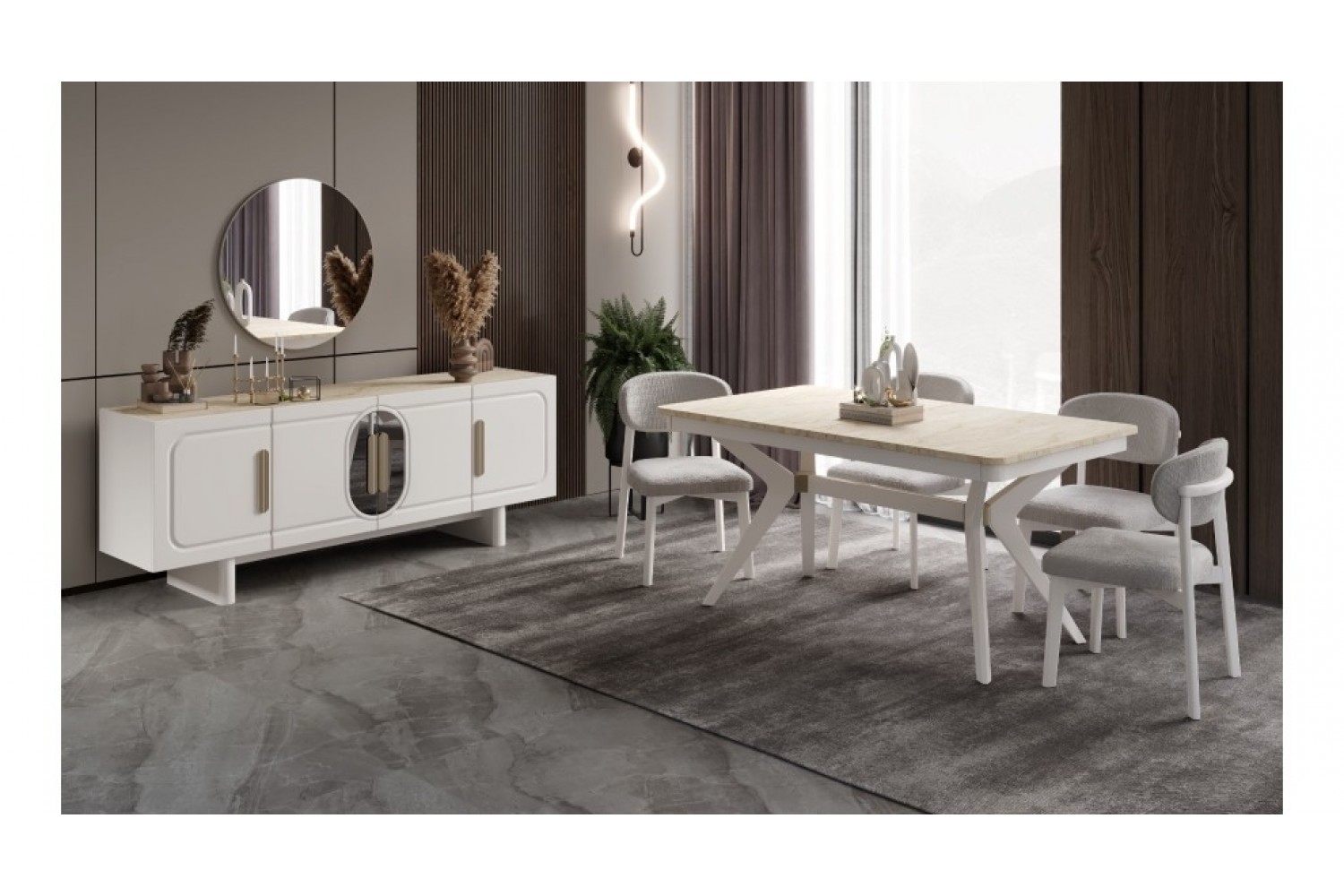 Takım İçeriği 1 adet masa + 4 adet sandalye + 1 adet Konsoldan oluşmaktadır. İsteğe bağlı Tv Ünitesi eklenebilmektedir. İsterseniz, Konsolu iptal edebilir yerine TV ünitesini seçebilirsiniz.
