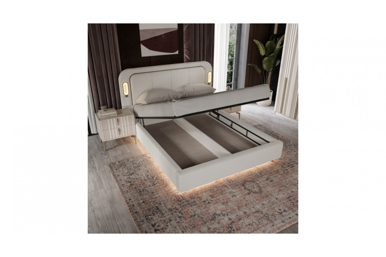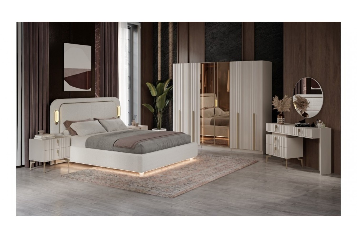 Takım İçeriği 1 Adet karyola,( kendinden bazalıdır) . 1 adet gardırop, 2 adet komidin ve 1 adet şifonyerden oluşmaktadır.
