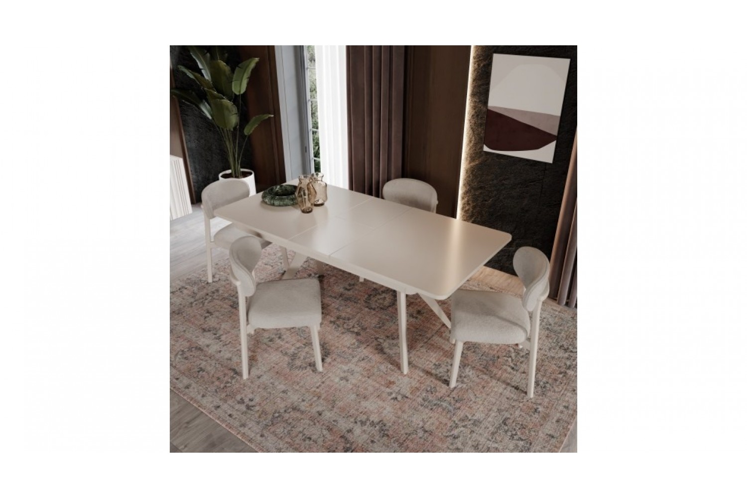 Takım İçeriği 1 adet masa + 4 adet sandalye + 1 adet Konsoldan oluşmaktadır. İsteğe bağlı Tv Ünitesi eklenebilmektedir. İsterseniz, Konsolu iptal edebilir yerine TV ünitesini seçebilirsiniz.