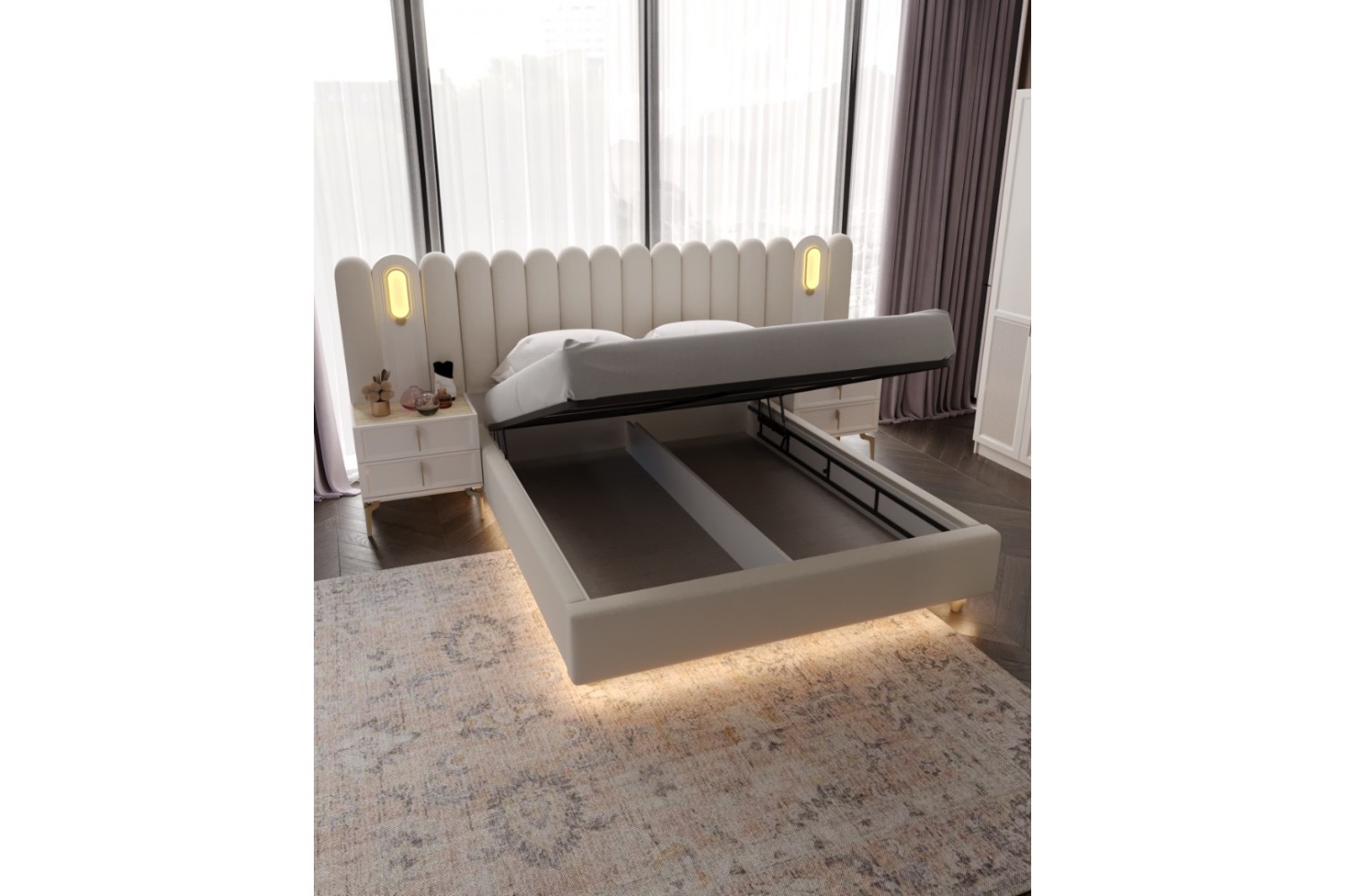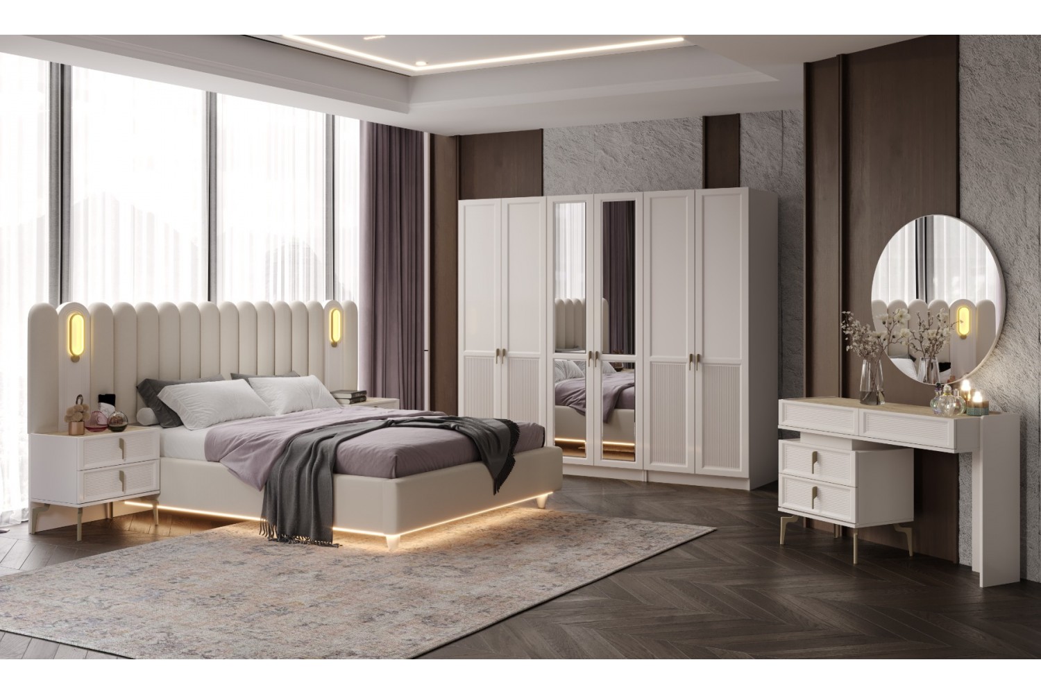 Takım İçeriği 1 Adet karyola,( kendinden bazalıdır) . 1 adet gardırop, 2 adet komidin ve 1 adet şifonyerden oluşmaktadır.