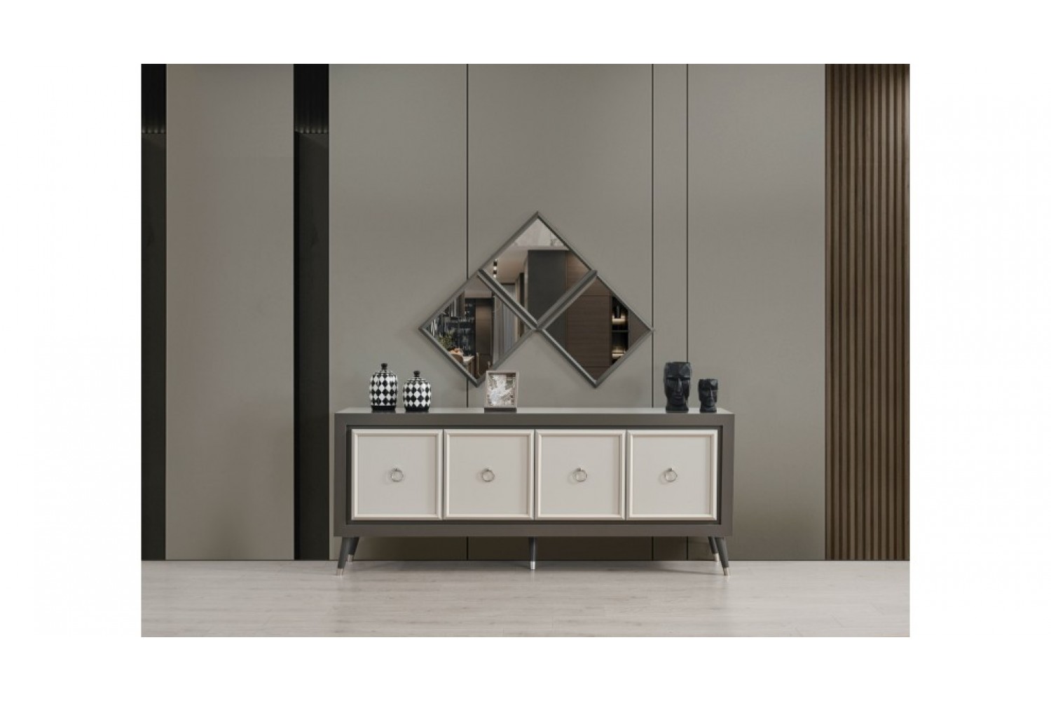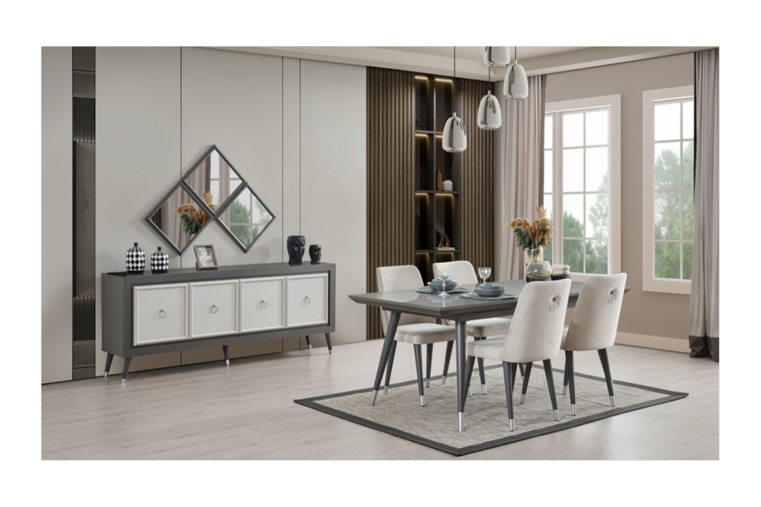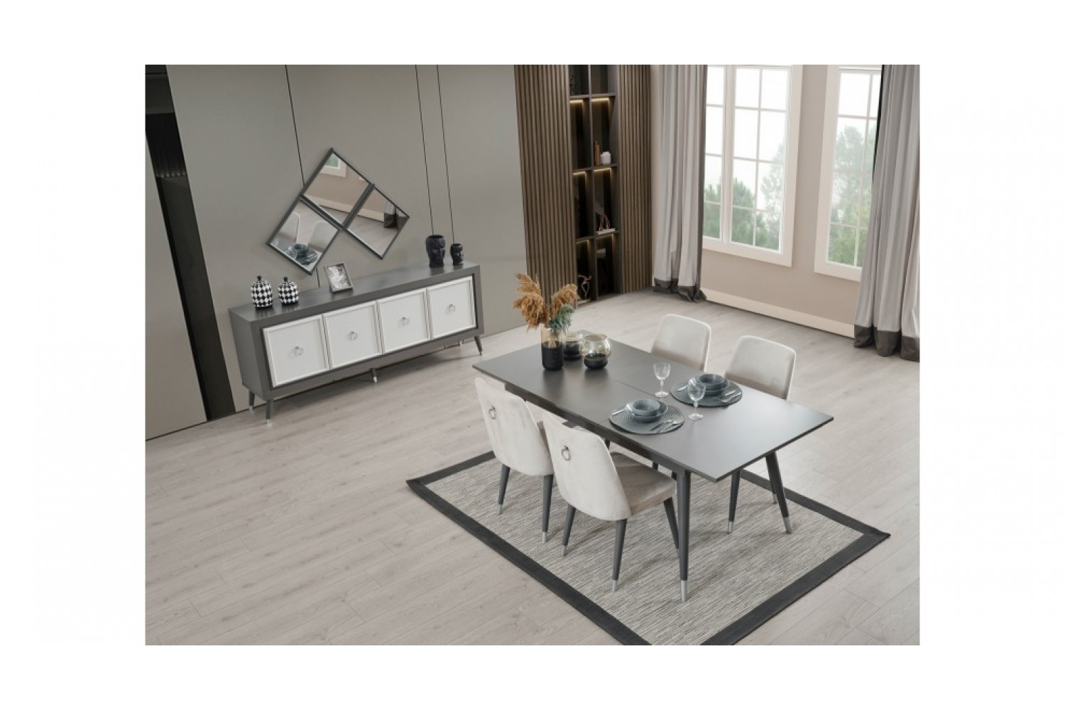 Takım İçeriği 1 adet masa + 4 adet sandalye + 1 adet Konsoldan oluşmaktadır. İsteğe bağlı Tv Ünitesi eklenebilmektedir. İsterseniz, Konsolu iptal edebilir yerine TV ünitesini seçebilirsiniz.