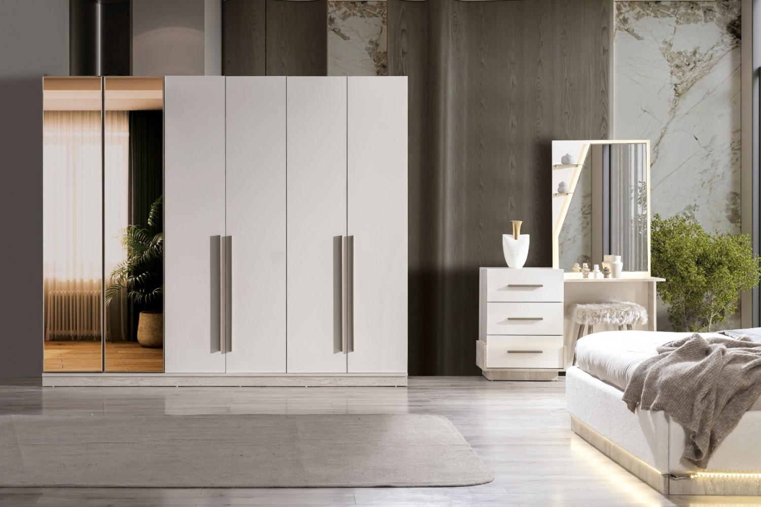 Takım İçeriği 1 Adet karyola,( kendinden bazalıdır) . 1 adet gardırop, 2 adet komidin ve 1 adet şifonyerden oluşmaktadır.