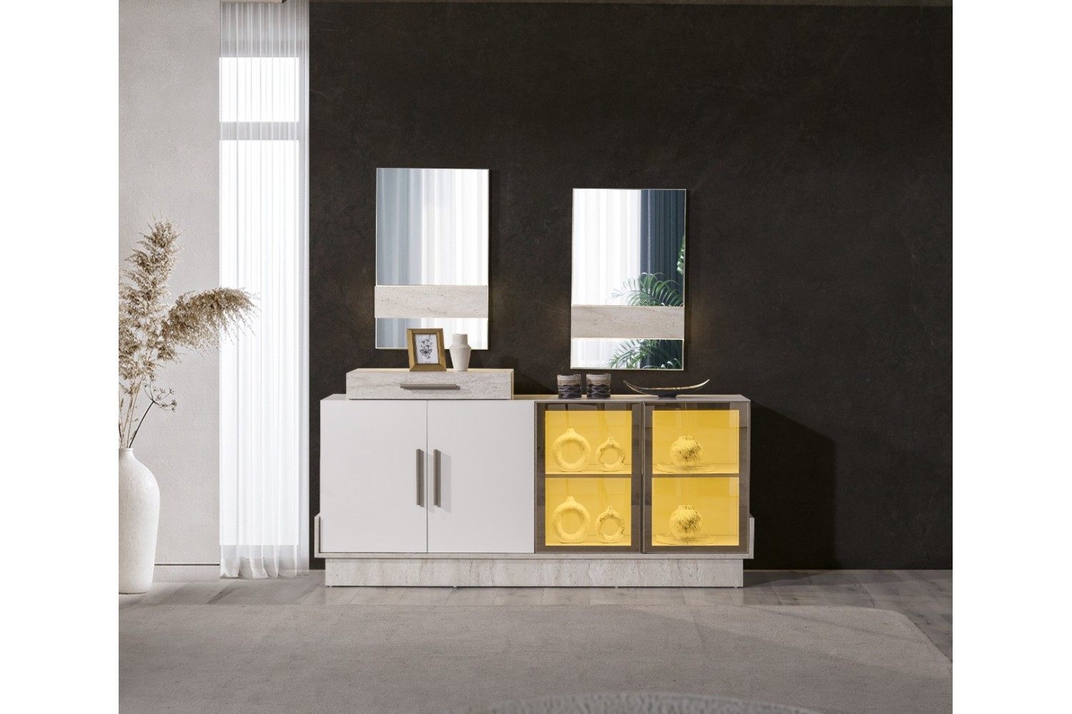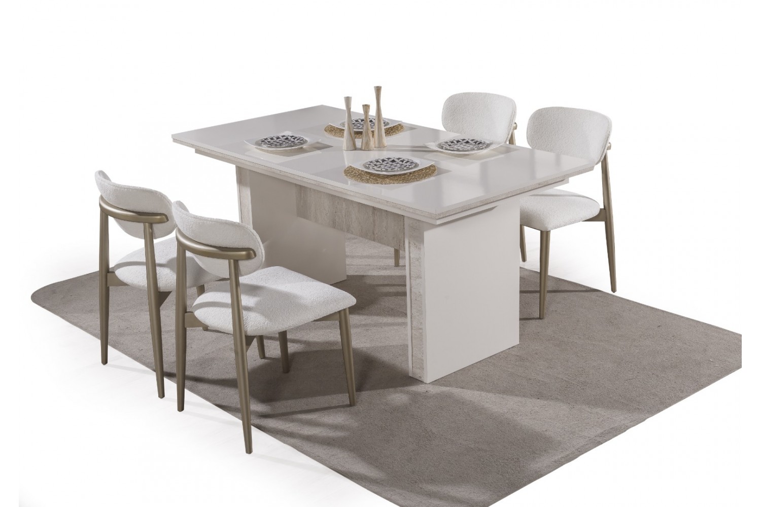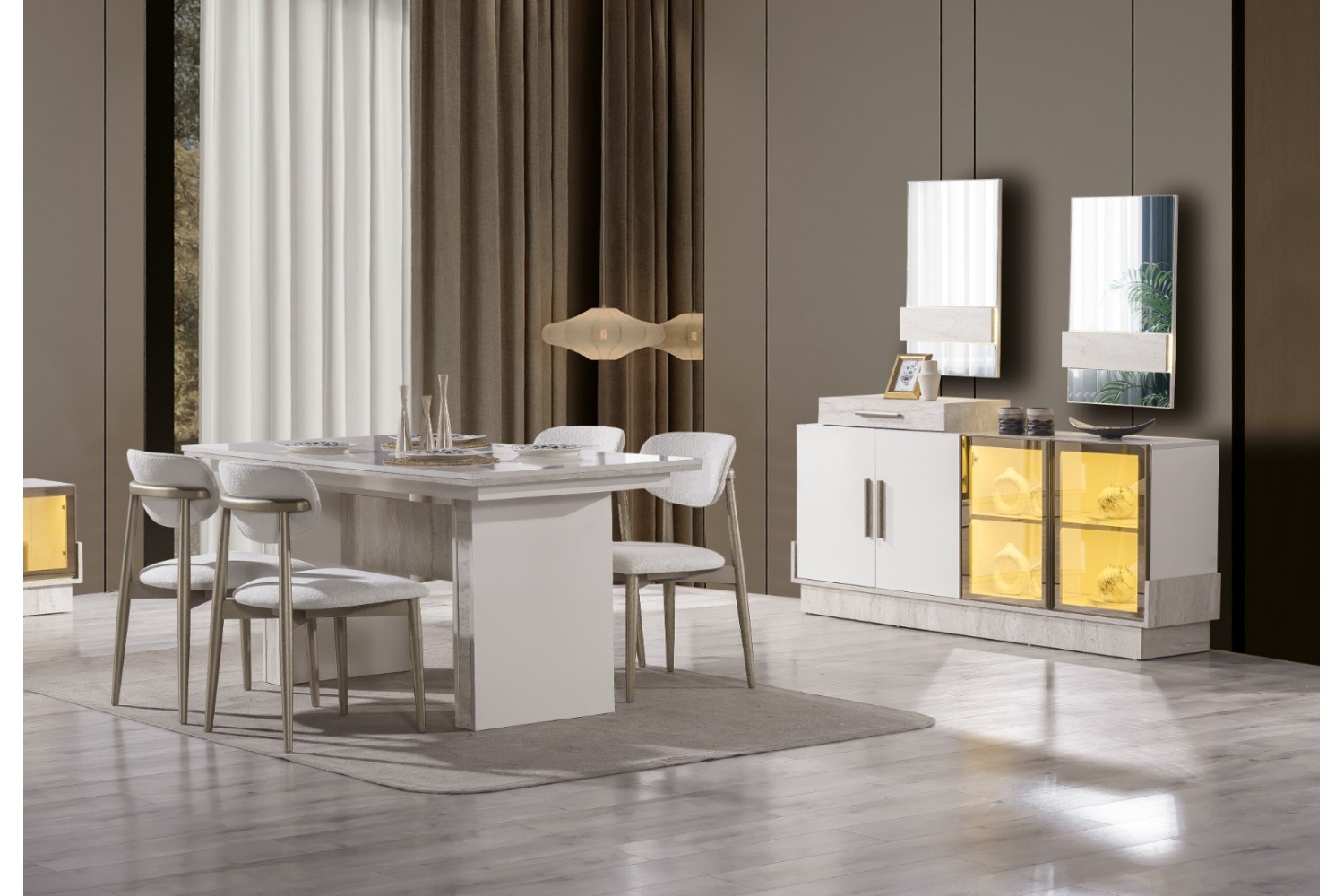 Takım İçeriği 1 adet masa + 4 adet sandalye + 1 adet Konsoldan oluşmaktadır. İsteğe bağlı Tv Ünitesi eklenebilmektedir. İsterseniz, Konsolu iptal edebilir yerine TV ünitesini seçebilirsiniz.