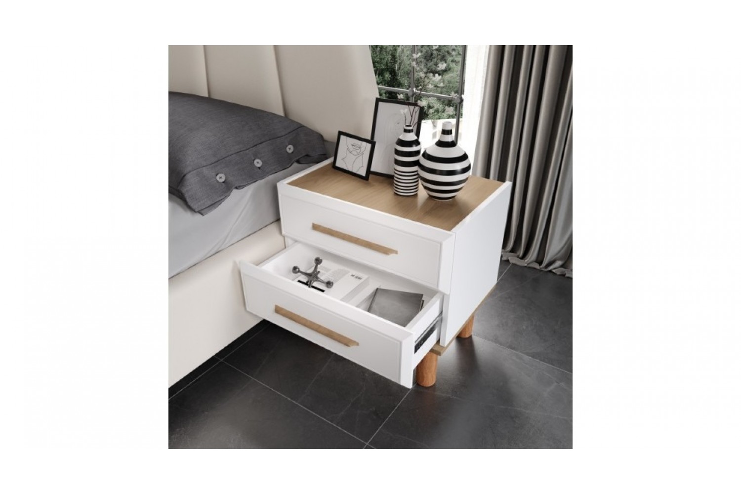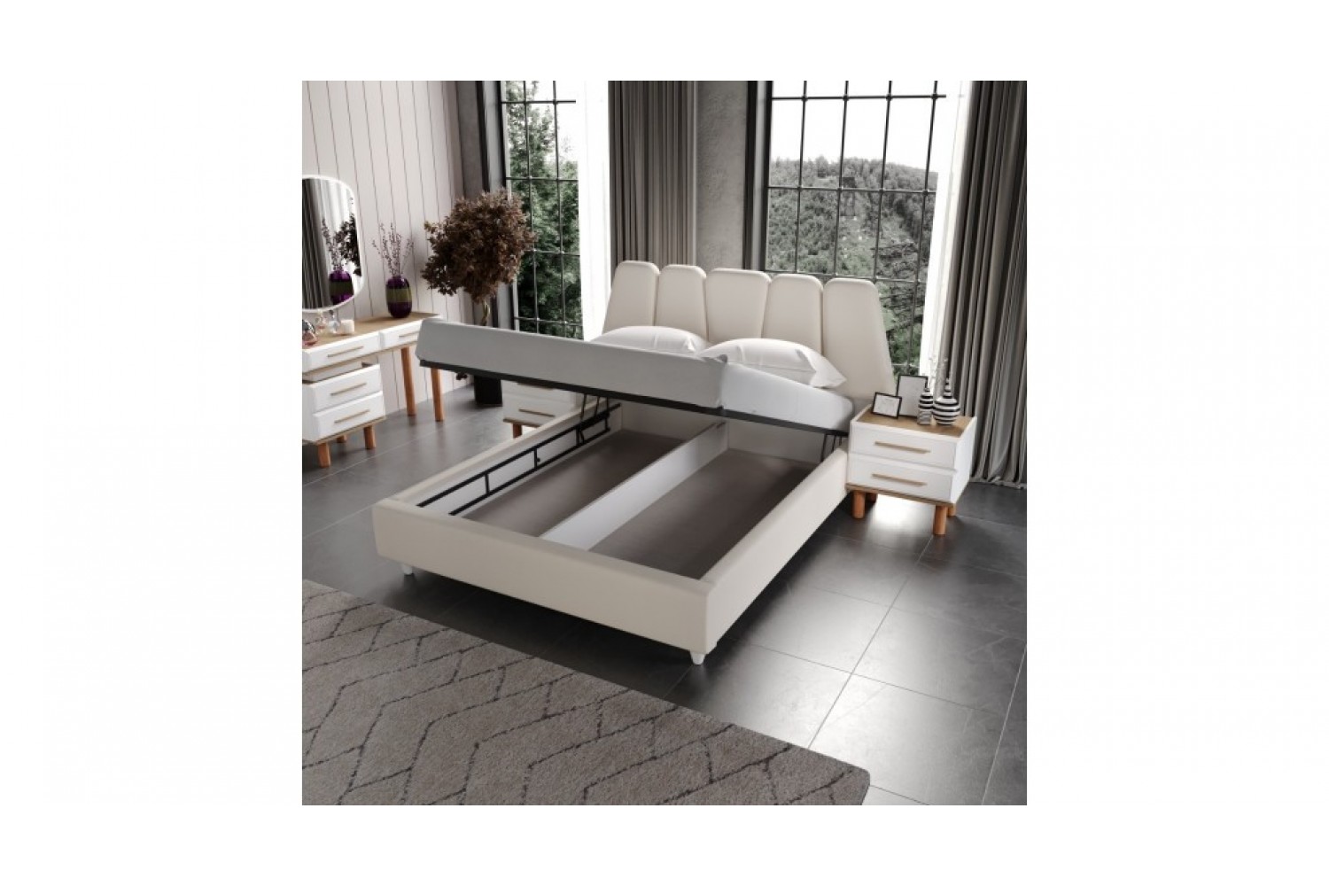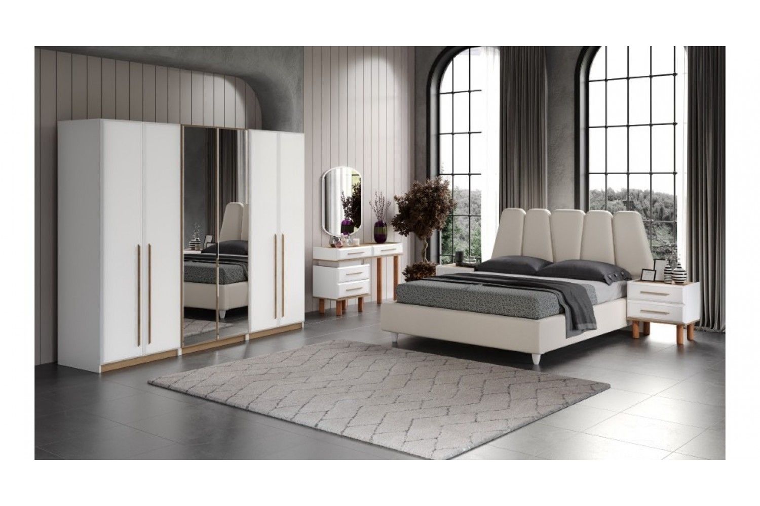 Takım İçeriği 1 Adet karyola,( kendinden bazalıdır) . 1 adet gardırop, 2 adet komidin ve 1 adet şifonyerden oluşmaktadır.