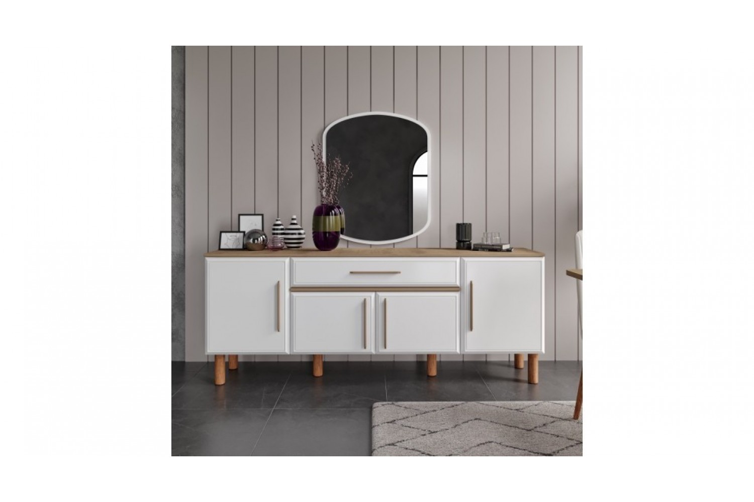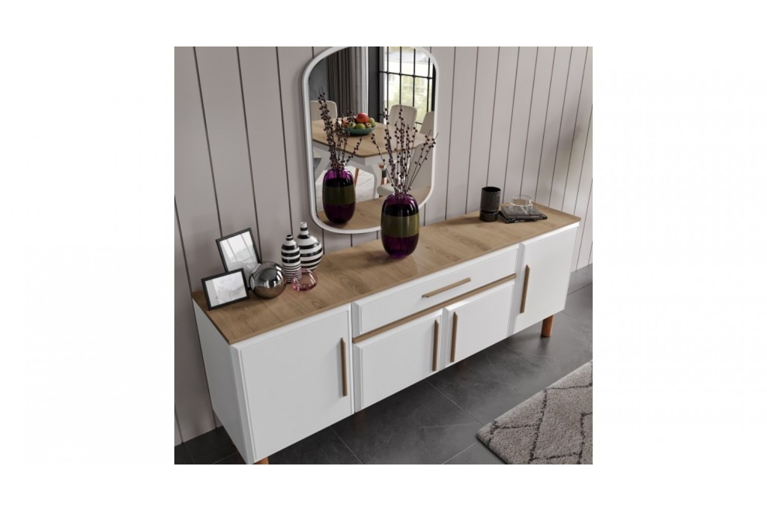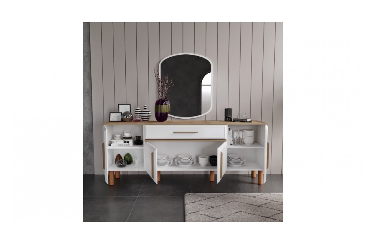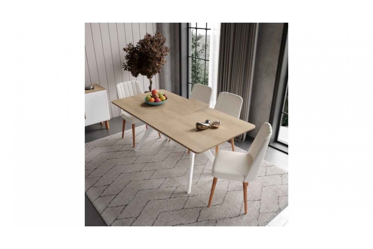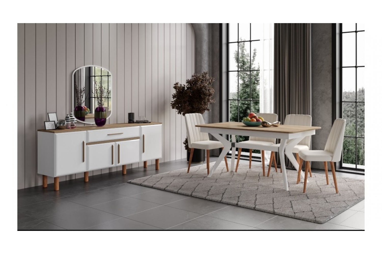 Takım İçeriği 1 adet masa + 4 adet sandalye + 1 adet Konsoldan oluşmaktadır. İsteğe bağlı Tv Ünitesi eklenebilmektedir. İsterseniz, Konsolu iptal edebilir yerine TV ünitesini seçebilirsiniz.