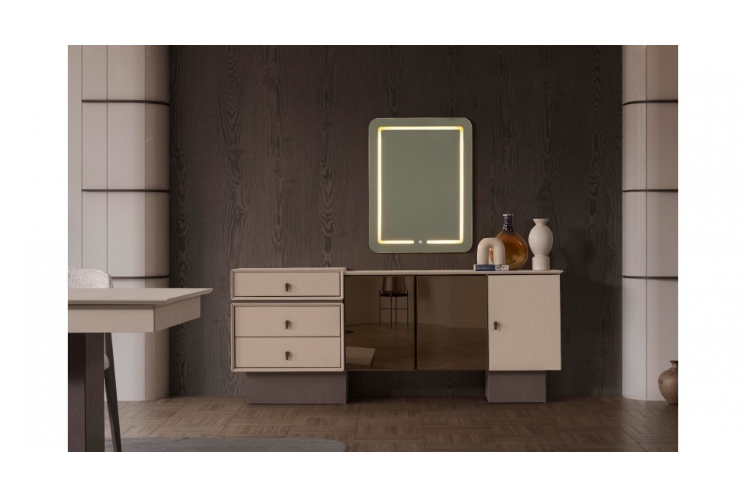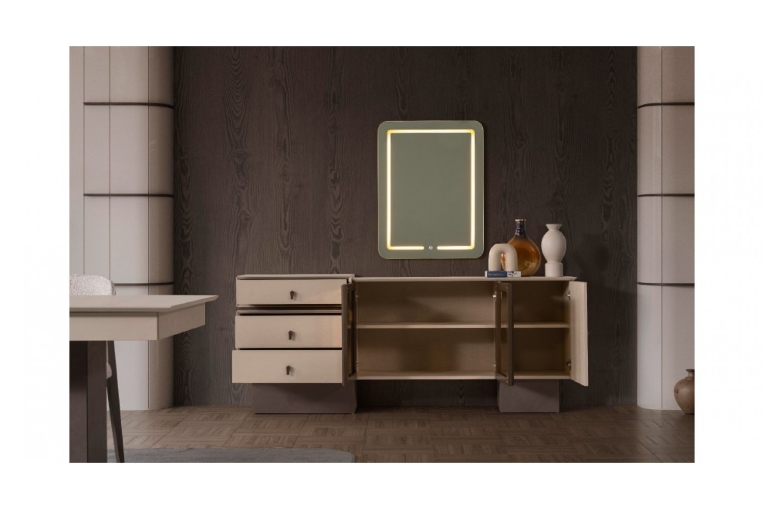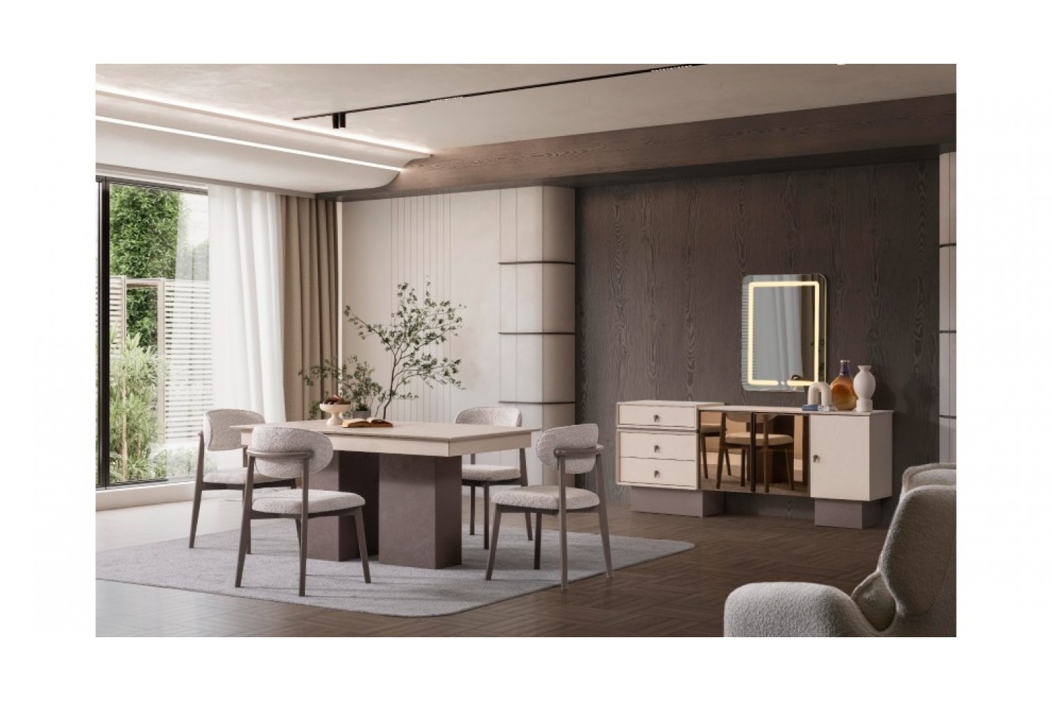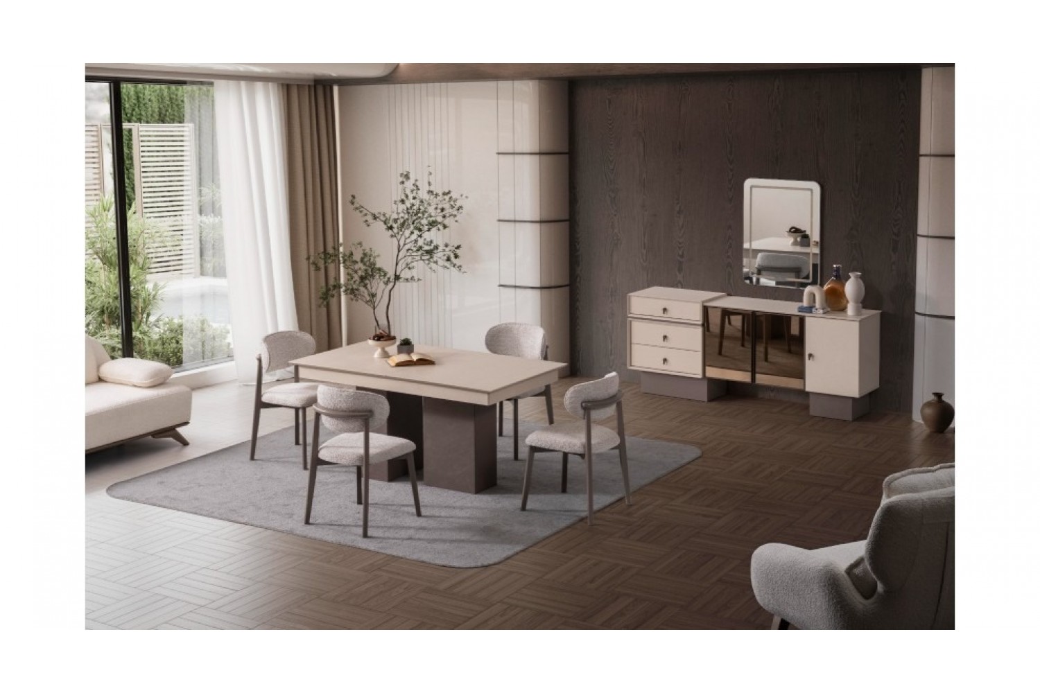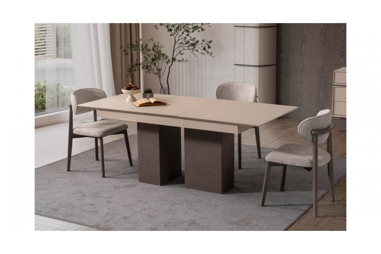 Takım İçeriği 1 adet masa + 4 adet sandalye + 1 adet Konsoldan oluşmaktadır. İsteğe bağlı Tv Ünitesi eklenebilmektedir. İsterseniz, Konsolu iptal edebilir yerine TV ünitesini seçebilirsiniz.