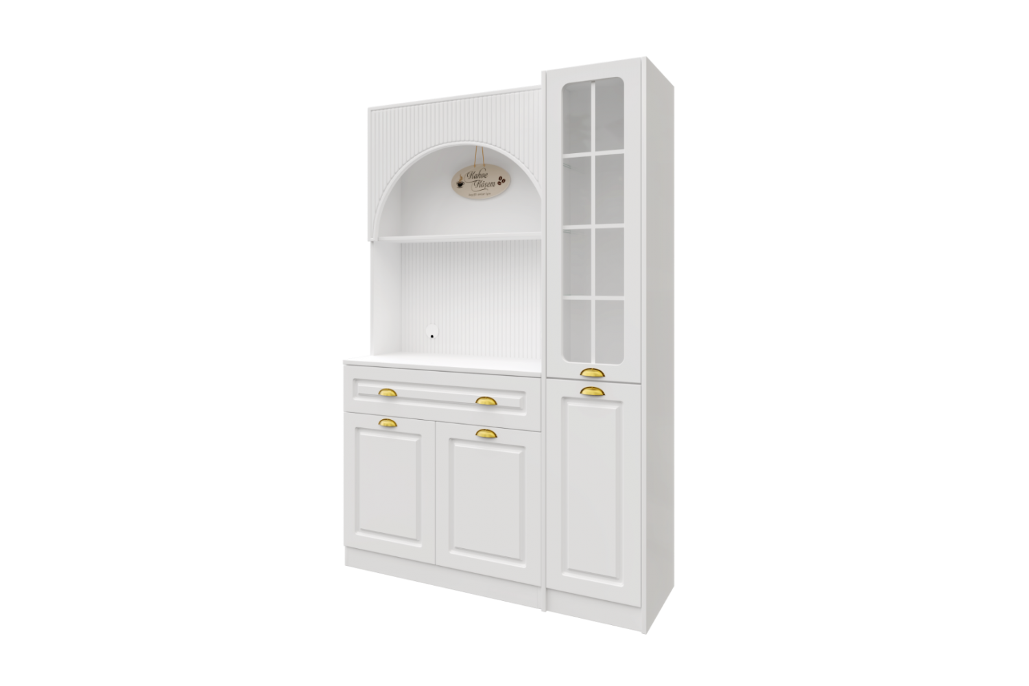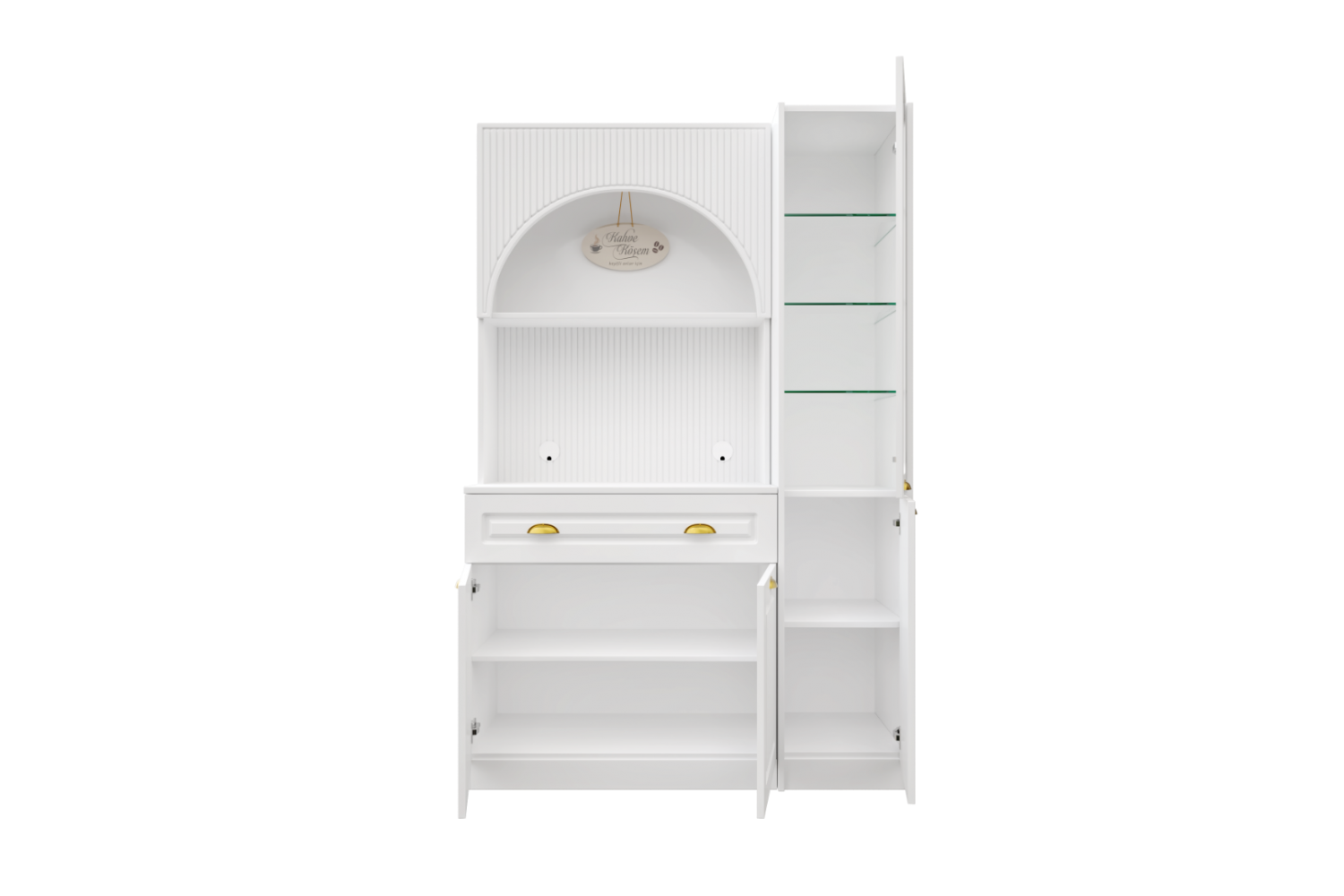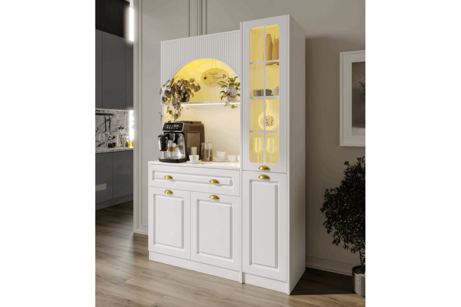 Sağ tarafta konumlandırılan vitrin modülü; camlı raf yapısı ve iç aydınlatmasıyla fincan, bardak ve dekoratif ürünlerin sergilenmesine olanak tanır. Komple MDF gövde yapısı dayanıklılık sağlarken, gold metal kulp detayları ürüne zarif ve bütüncül bir görünüm kazandırır.