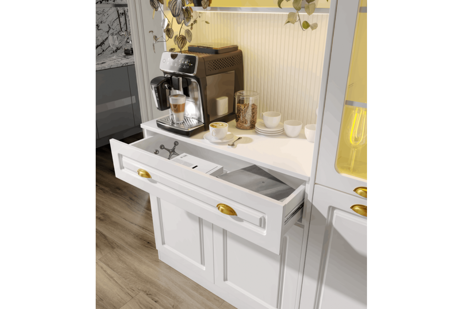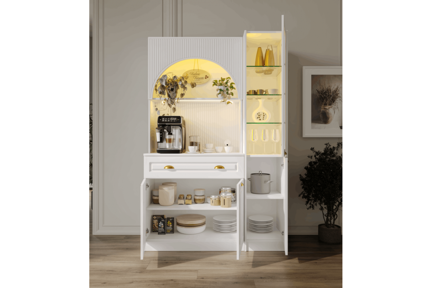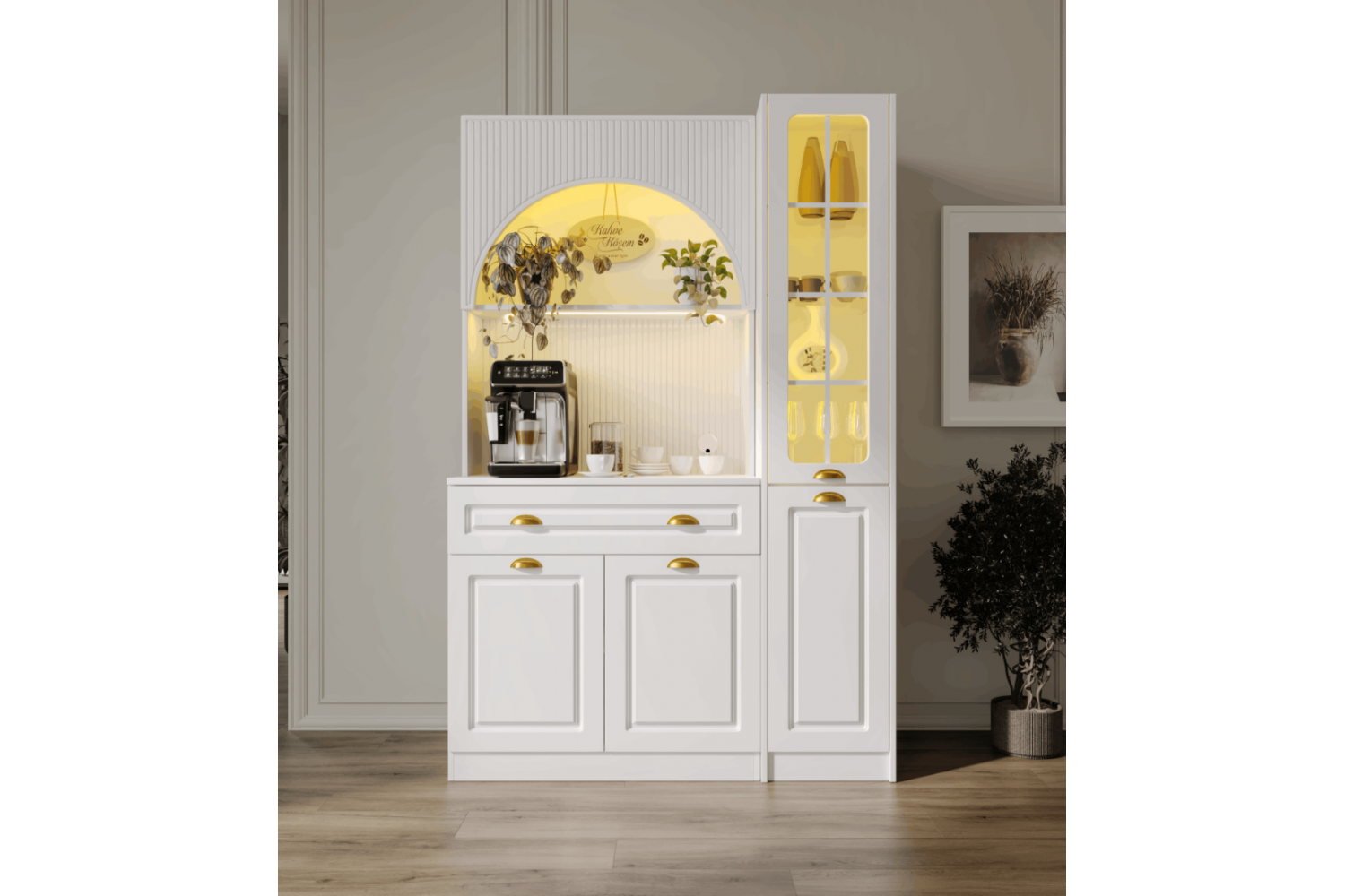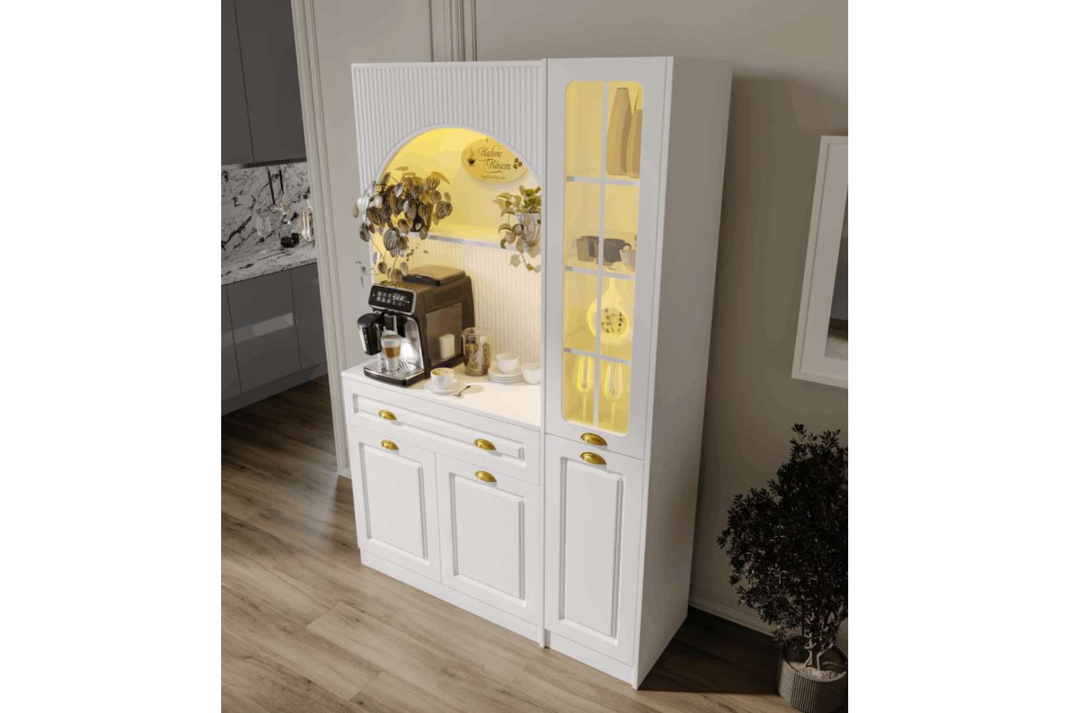 Kemer formuna sahip üst modül ve entegre aydınlatmalı açık niş alanı, kahve makinesi ve günlük kullanım ürünleri için konforlu bir hazırlık alanı oluşturur. Alt modülde yer alan kapaklı dolap bölümü ise fincan, kahve ekipmanları ve aksesuarlar için düzenli saklama imkânı sağlar.