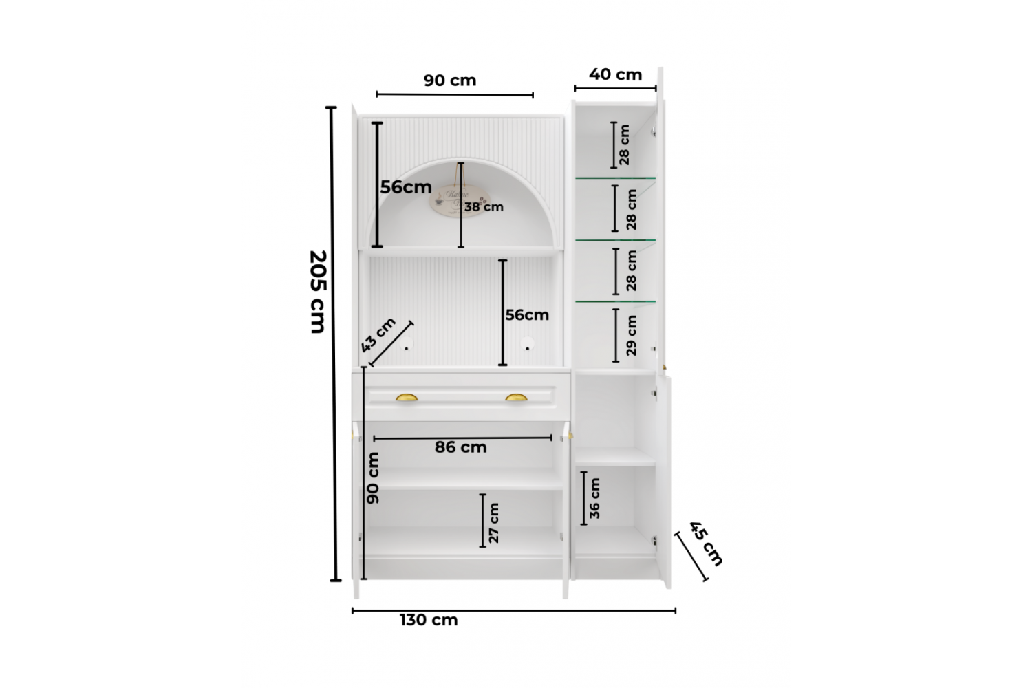 - Sağ Vitrin: Genişlik 40 cm / Yükseklik 205 cm / Derinlik 45 cm