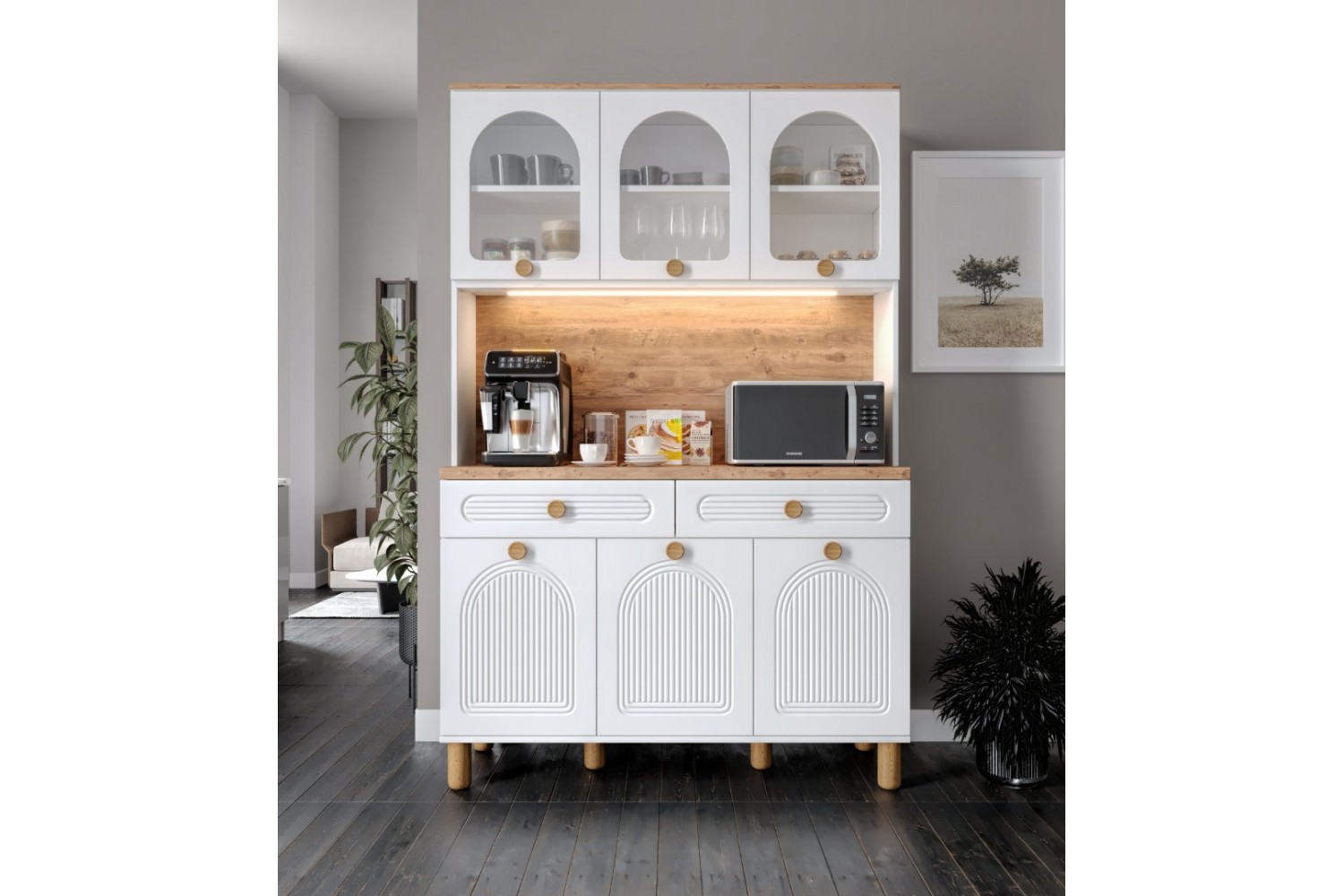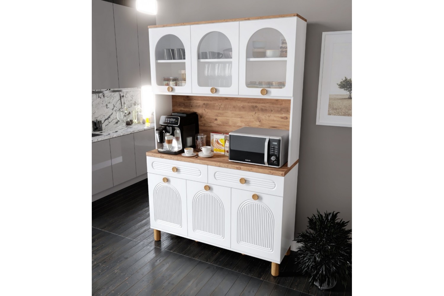 Rosa 140 cm Kahve Köşesi, fonksiyonel tasarımı ve estetik görünümüyle mutfağınıza şıklık katar. Tamamen MDF gövde yapısı ve membran kapakları ile uzun ömürlü kullanım sunar. LED aydınlatmalı yapısı sayesinde kahve makinesi, airfryer ve küçük mutfak gereçleriniz için ideal bir alan oluşturur. Yavaş kapanan kapaklar ve frenli teleskopik raylı çekmeceler ile konforlu kullanım sağlar.