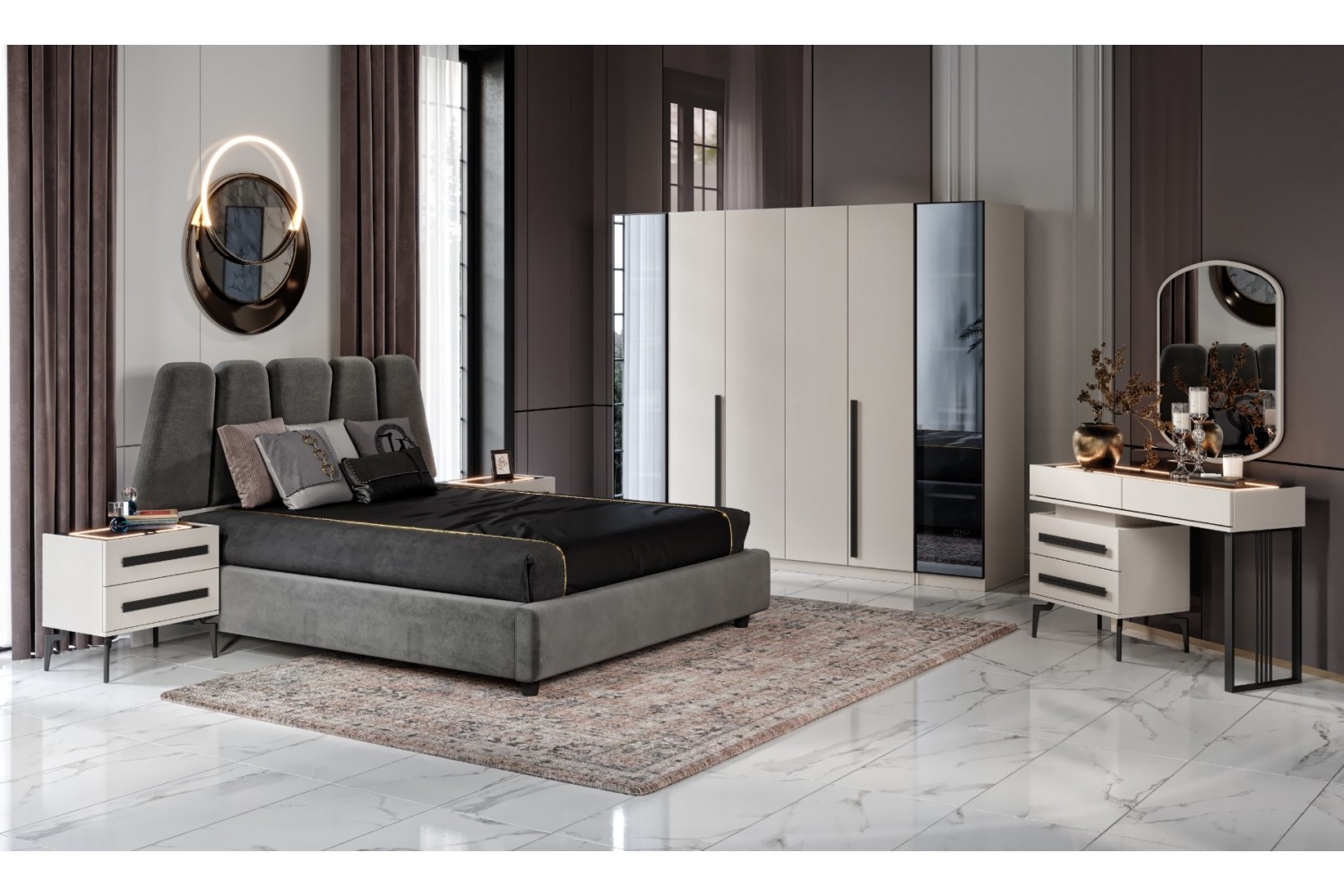 Takım İçeriği 1 Adet başlık ve çelik profil baza , 1 adet gardırop, 2 adet komidin ve 1 adet şifonyerden oluşmaktadır.