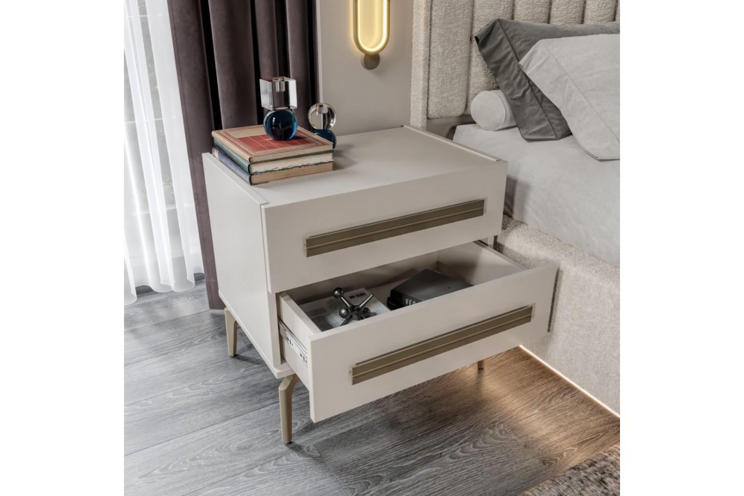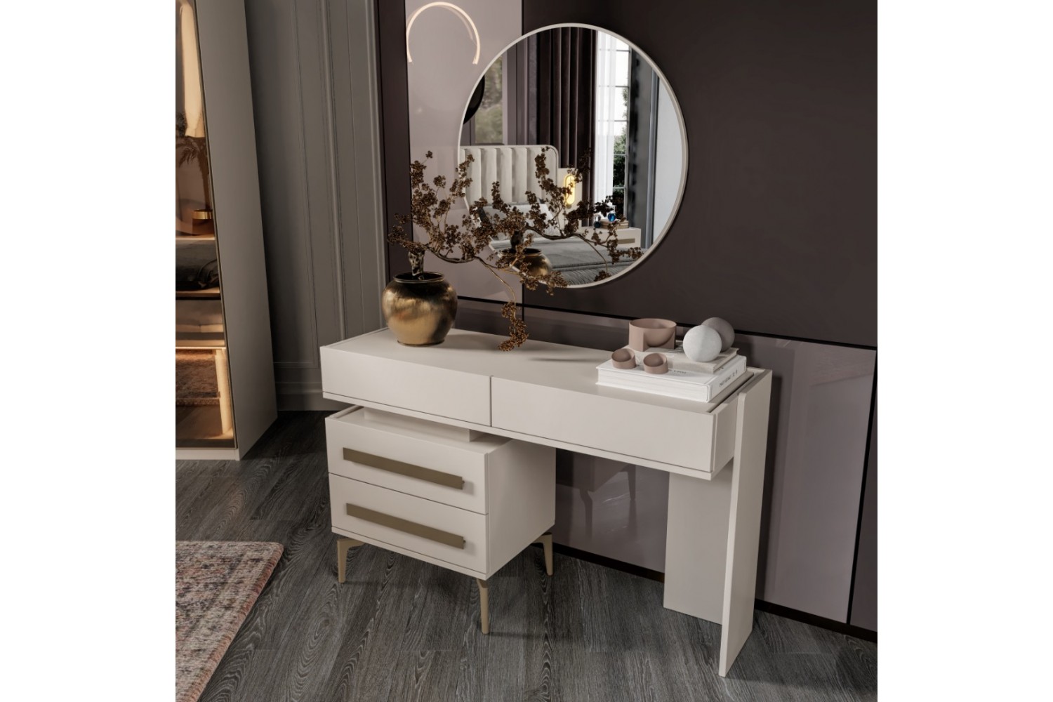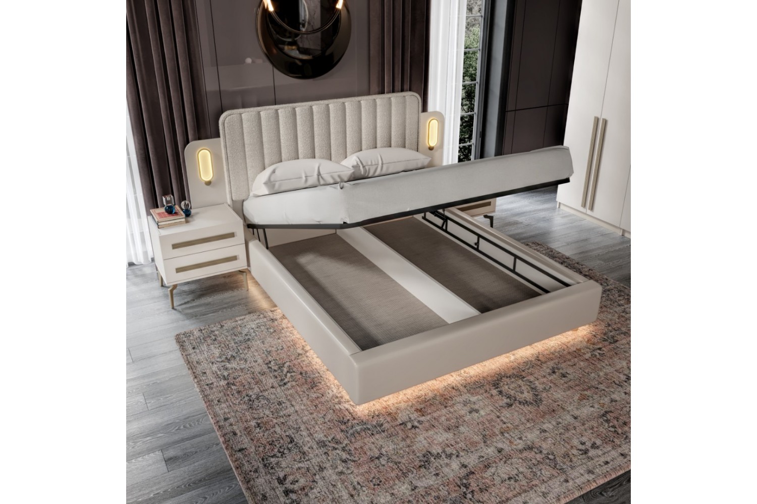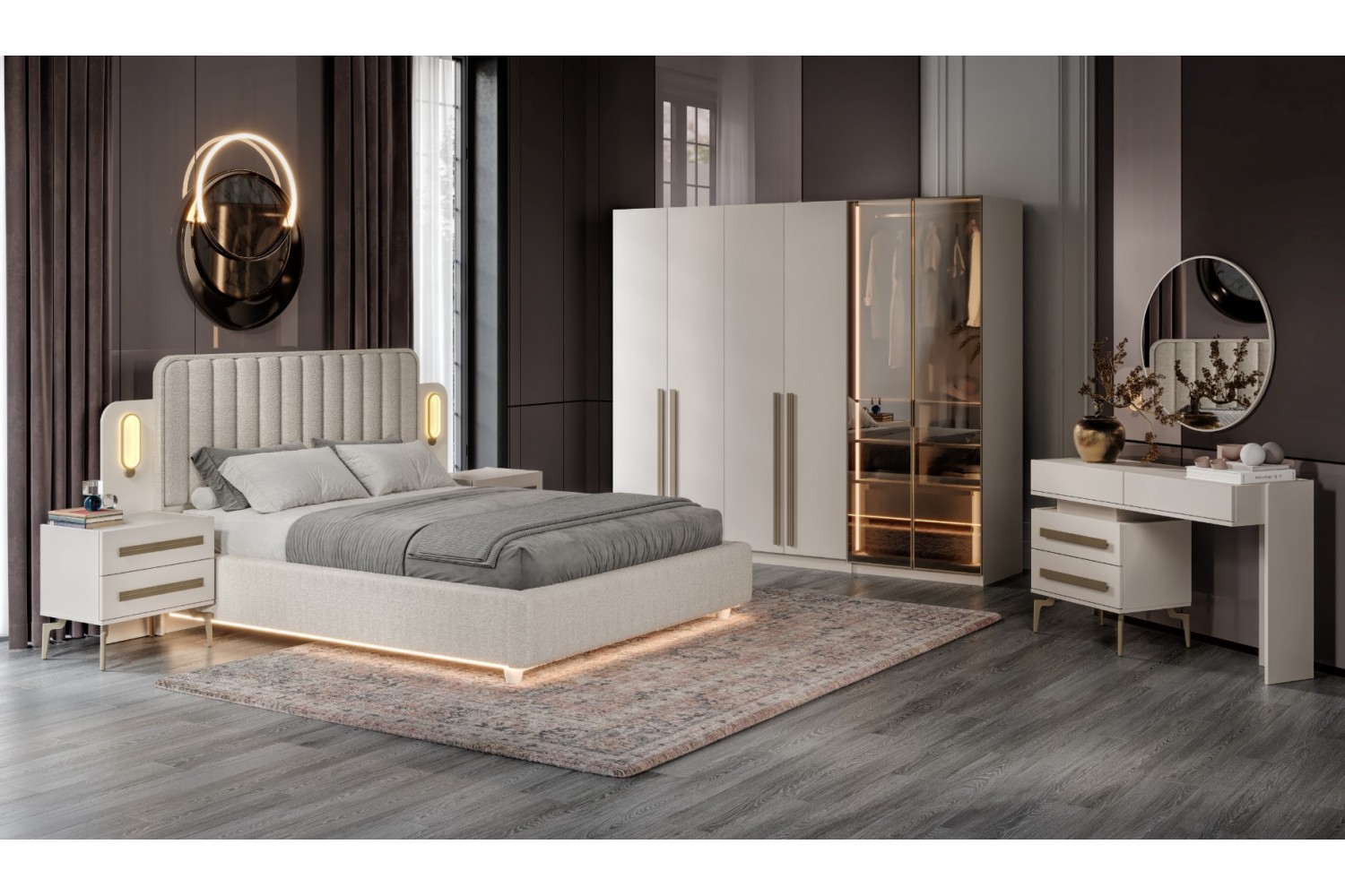 Takım İçeriği 1 Adet başlık ve çelik profil baza , 1 adet gardırop, 2 adet komidin ve 1 adet şifonyerden oluşmaktadır.