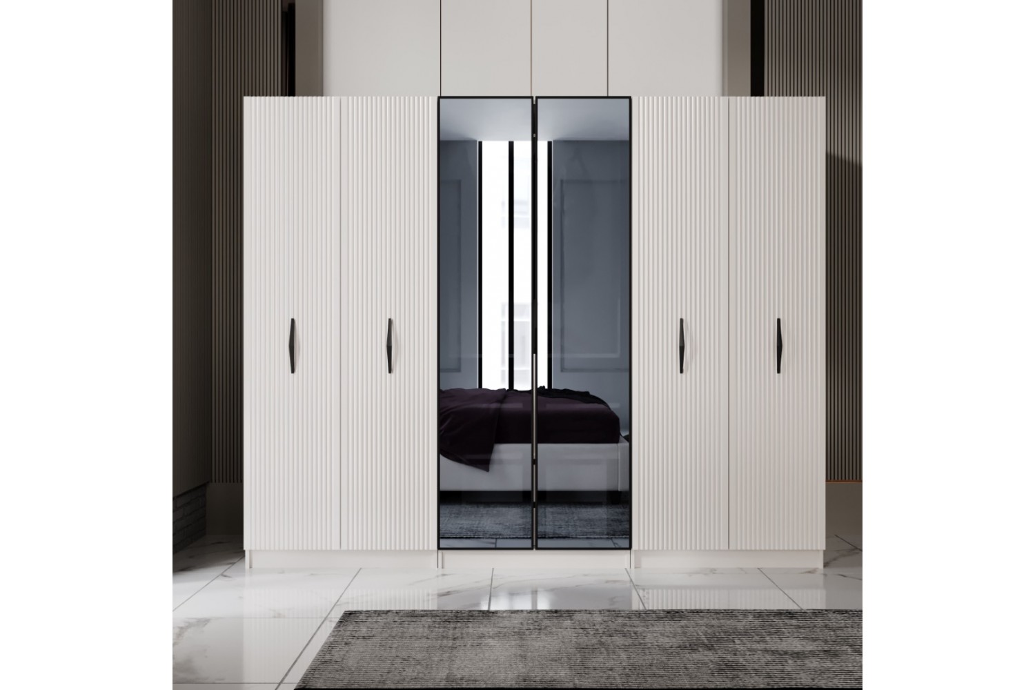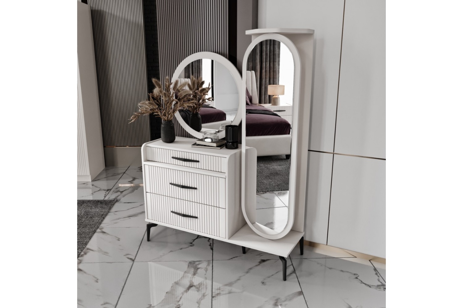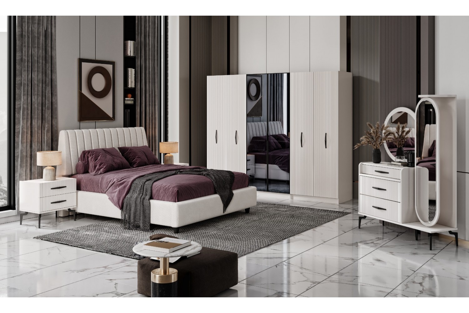 Takım İçeriği 1 Adet başlık ve çelik profil baza , 1 adet gardırop, 2 adet komidin ve 1 adet şifonyerden oluşmaktadır.